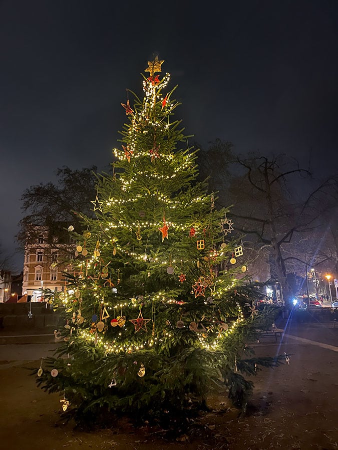 HANNOVER. Weihnachtsstimmung auf dem Fiedelerplatz im Stadtteil Döhren. Dank der Interessengemeinschaft Döhrener Geschäftsleute (IDG) brennen am Weihnachtsbaum auch in diesem Jahr wieder die Lichter. Kinder haben dazu den tollen Baumschmuck gebastelt. Tip: Am 19. Dezember 2025 lädt ab 18 Uhr die Kulturinitiative Döhren-Wülfel-Mittelfeld zum gemeinschaftlichen Singen unterm Tannenbaum ein.