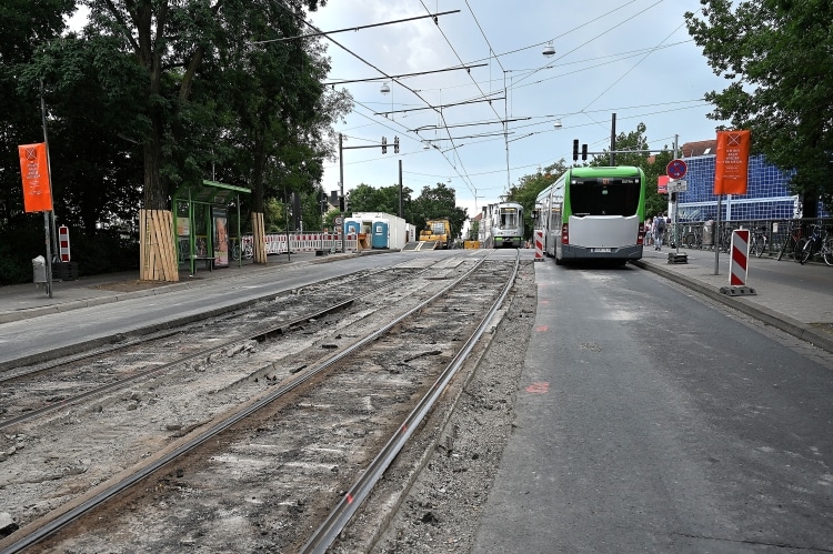 HANNOVER. Die Stadtbahnhaltestelle im Bereich Bahnhof Nordstadt ist die letzte nicht barrierefreie der Linie 6 Nordhafen – Messe/Ost(EXPO-Plaza). Planungen zum barrierefreien Ausbau in mehreren Varianten gibt es schon seit Jahren. Allerdings war noch auf die Brückenplanungen der Deutschen Bahn (DB) Rücksicht zu nehmen und entsprechende Abstimmungen erforderlich. Wegen der komplizierten Geometrie der Über- und Unterführungen wurde nur eine Hochbahnsteiglage vor der Einmündung der Petersstraße als realistisch durchführbar angesehen. Am Montag, 23. Juni, starteten nun vorbereitende Maßnahmen und am Donnerstag, 26. Juni, begannen die umfangreichen Bauarbeiten am Engelbosteler Damm im Bereich der Stadtbahnhaltestelle Bahnhof Nordstadt. Den Auftakt bildet der Einbau einer Bauweiche in die Stadtbahngleise sowie die Sperrung des stadtauswärtigen Brückenüberbaus. Die Landeshauptstadt Hannover führt eine umfassende Grundsanierung der Brücke über die Bahnstrecke durch. Die Arbeiten erfolgen in zwei Bauabschnitten und sollen bis Ende 2026 abgeschlossen sein. Dabei werden die gesamten Brückenbeläge inklusive Gleise, Übergangskonstruktionen und Abdichtungen vollständig erneuert. Zugleich werden die Nebenanlagen verbreitert, um mehr Raum für Fuß- und Radverkehr zu schaffen. Während der gesamten Bauzeit bleiben der Stadtbahnverkehr sowie der Zugang zum S-Bahnhof Nordstadt durchgehend erhalten. Auch Fußgängerinnen und Fußgänger sowie Radfahrende können die Baustelle weiterhin passieren. Für den Individual- und Stadtbusverkehr ist im ersten Bauabschnitt (voraussichtlich bis Mitte Januar 2026) eine stadteinwärtige Nutzung der Brücke noch möglich. Im zweiten Bauabschnitt wird der Kfz- und Busverkehr über die Brücke vollständig eingestellt. Umleitungen werden großräumig ausgeschildert. Parallel dazu beginnt die infra ab Mitte 2025 mit vorbereitenden Leitungsarbeiten nördlich der Brücke. Diese sind Voraussetzung für den späteren Bau des neuen Hochbahnsteigs. Die eigentlichen Bauarbeiten für die neue Stadtbahnhaltestelle „Bahnhof Nordstadt“ beginnen aus ablauftechnischen Gründen erst nach Abschluss der Brückensanierung, also voraussichtlich Mitte 2027. Der neue Hochbahnsteig wird rund 30 Meter nördlich der bisherigen Haltestelle entstehen. Als dritte Maßnahme plant die Deutsche Bahn die Erneuerung der Eisenbahnüberführung über die Schulenburger Landstraße, die etwas weiter nördlich liegt. Nach aktuellem Planungsstand sollen diese Arbeiten bis Ende 2028 abgeschlossen sein. Im Anschluss wird die infra den Bereich zwischen dem neuen Hochbahnsteig und der Fenskestraße fertigstellen und das Gesamtprojekt abschließen.