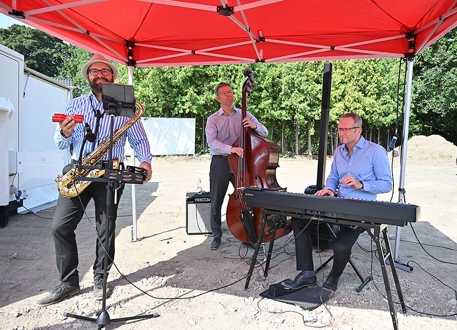 Nach diesem feierlichen Baustart ging es gemütlich weiter. Das DRK hatte einen kleinen Imbiss organisiert, es gab reichlich kalte Getränke und das Helge Adam Trio unterhielt die Gäste musikalisch.