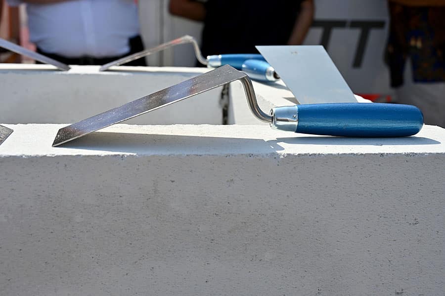 Nach den kurzen Ansprachen von Martina Rust, Steffen Krach und Axel von der Ohe ging es zur Sache. Ein paar Euro-Münzen, Urkunden und eine aktuelle Tageszeitung verschwanden in einer Metallkapsel. Die Kapsel selbst wurde dann in den Grundstein niedergelegt. Anschließend musste die anwesende Prominenz Bauhelme aufsetzen und Handschuhe anziehen, zur Maurerkelle greifen und dick Mörtel auftragen, damit der Grundstein schließlich mit einer Platte abgedeckt werden konnte.