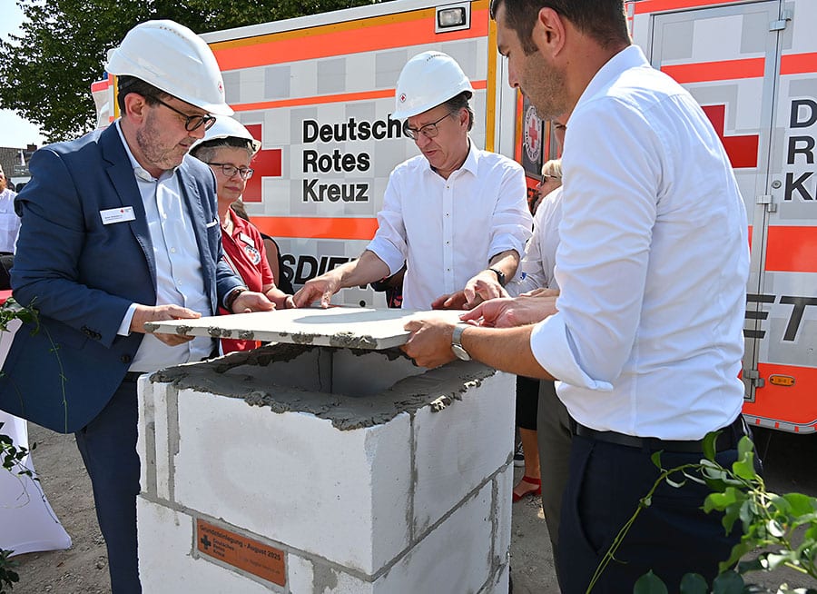 HANNOVER. Ein bisschen Mörtel auf ein paar Steine zu schmieren kann ganz schön schweißtreibend sein. Vor allem wenn die Sonne vom Himmel knallt, das Thermometer auf über 33 Grad steigt und für die Fotografen Handschuhe und Bauhelme getragen werden müssen. Zusammen mit Regionspräsident Steffen Krach und Hannovers 1. Stadtrat Axel von der Ohe feierte das Deutschen Roten Kreuz (DRK) heute Mittag (14. August) die Grundsteinlegung für einen Neubau an der Zeißstraße 79 in Döhren.