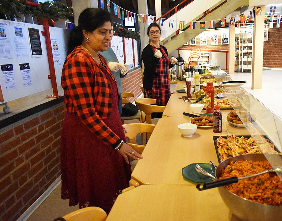 Am Büfett: links die 2. Vorsitzende vom Verein „Schönes Mittelfeld (SchMitt) Kamaly Sandran
