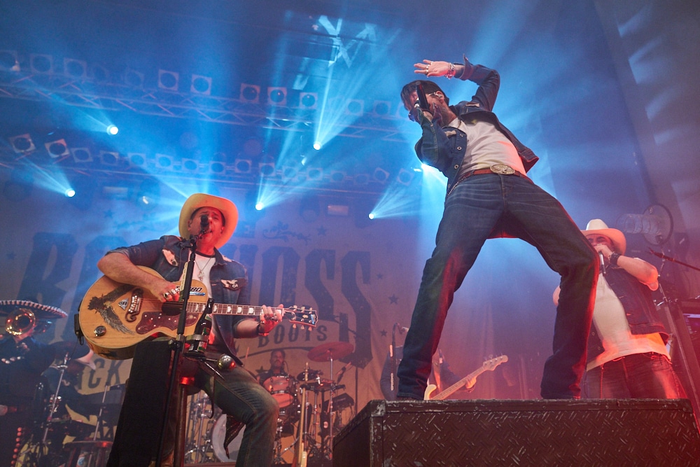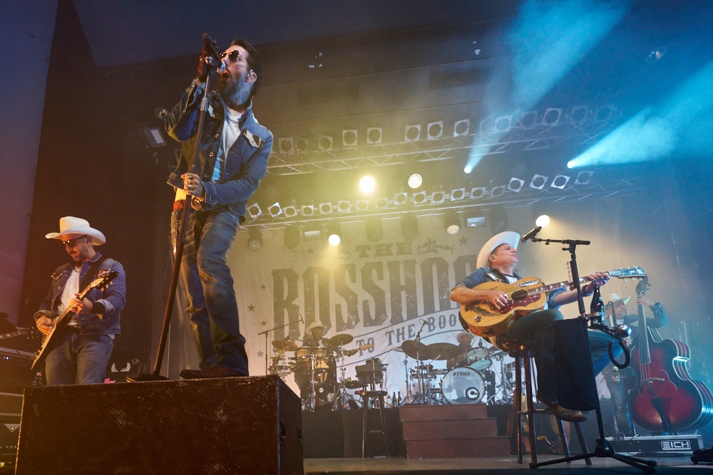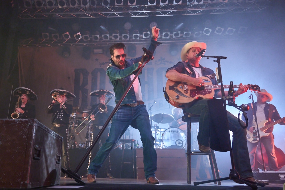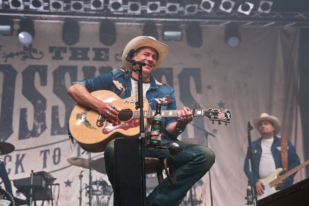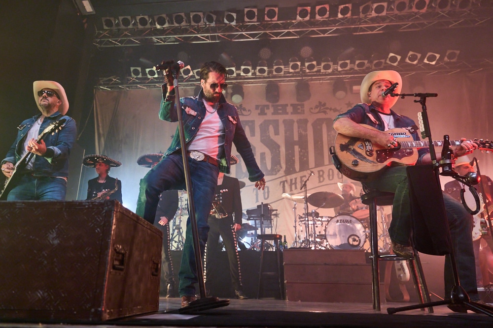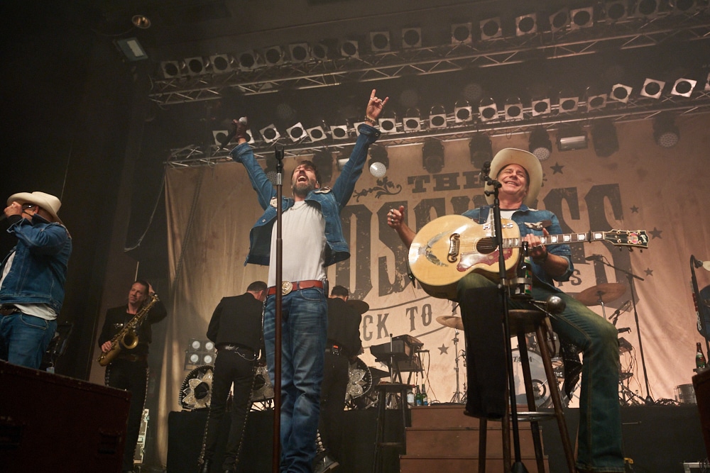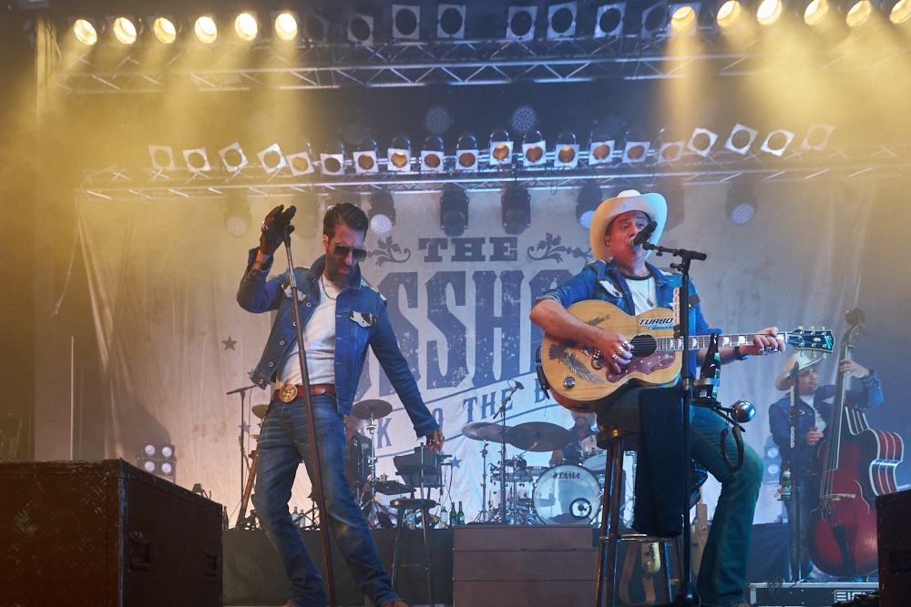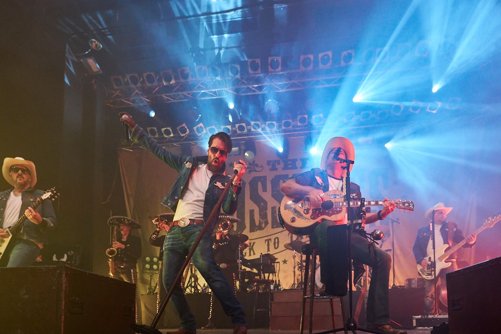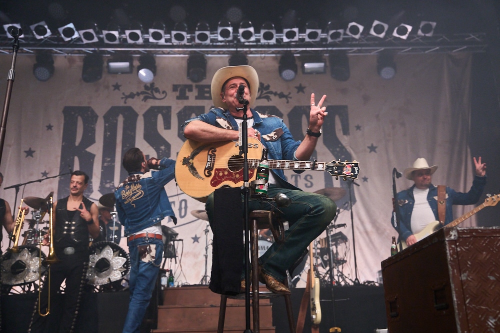 Schon bei den ersten Takten von „On the Road Again“ ging ein Ruck durch die Menge. Die Frontmänner Alec „Boss Burns“ Völkel und Sascha „Hoss Power“ Vollmer traten energisch auf, stimmlich klar und mit viel Präsenz. Die restliche Band, darunter Mandoline, Gitarre, Bass, Schlagzeug und Percussion, formte gemeinsam mit der Bläsersektion „Tijuana Wonderbrass“ einen massiven und abgerundeten Sound.