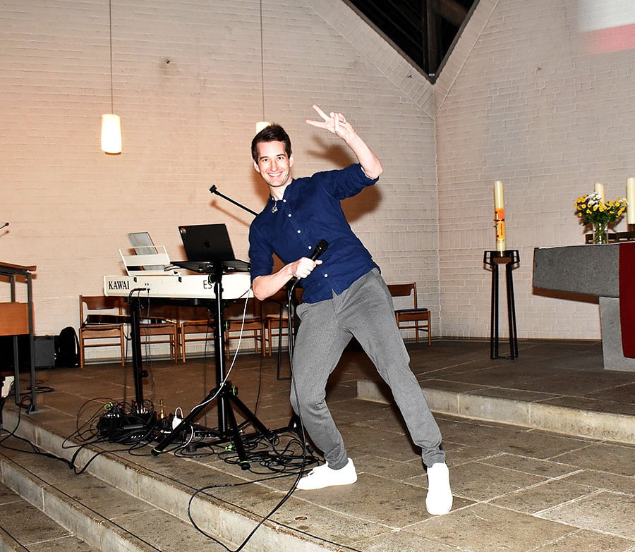 Um sich gemeinsam glücklich zu singen hatte die Gemeinde Mirko Schelske eingeladen. Der erfahrene Sänger, Chorleiter und Arrangeur schaffte es binnen kurzer Zeit, die Stimmung aufzulockern, für eine fröhliche, singfreudige Atmosphäre zu sorgen und das Kirchenschiff zu einer Wohlfühlzone zu machen.