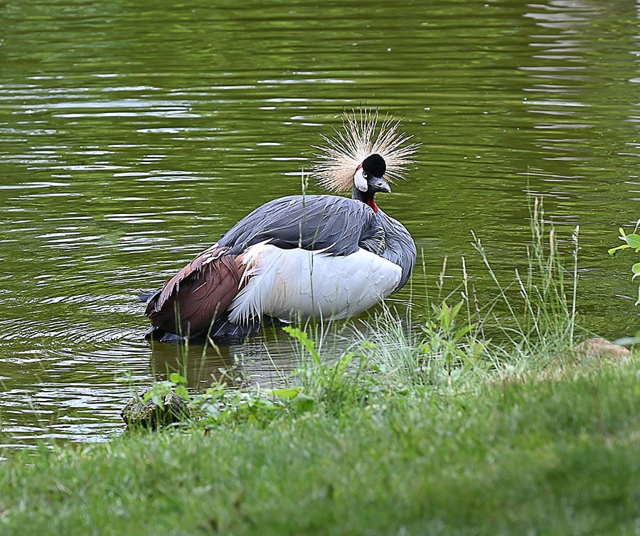 Der Kronenkranich lebt in den Feuchtgebieten und Grasländern Südost-Afrikas. Er erreicht 100 bis 110 cm Kopfhöhe bei bis zu 200 cm Flügelspannweite und ernährt sich u.a. von Amphibien und Insekten. Auf der „Roten Liste“ wird das Tier als „stark gefährdet“ geführt. Weil Feuchtgebiete in landwirtschaftlich genutzte Flächen umgewandelt werden, zudem durch den Klimawandel einige Landstriche immer trockener werden, gibt es immer weniger Plätze zum Brüten. Auch der Mensch stört zusehends den Vogel.